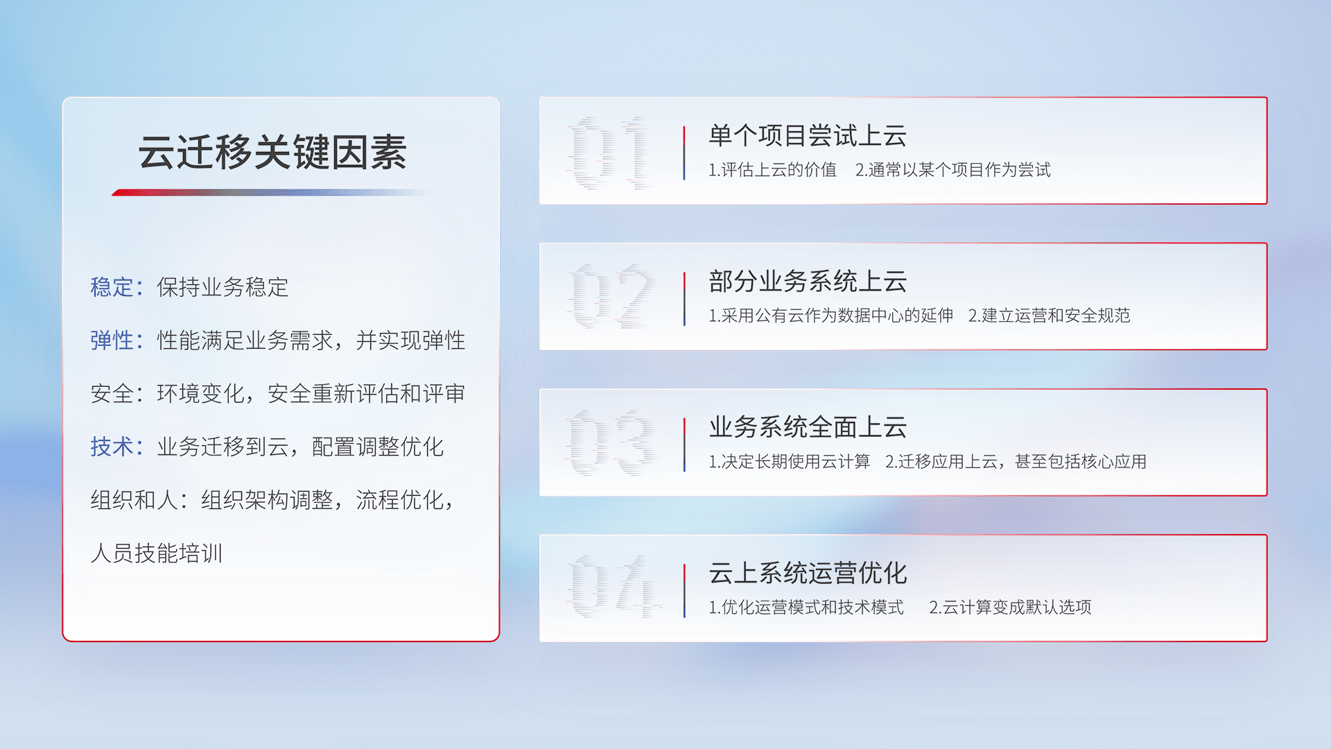 结合实际业务,,,,从规划设计、、云平台选型、、云原生改造、、、数据迁移、、、集成交付,,,迁移全过程为客户识别最佳上云路径,,,做好风险识别管理,,,,设计网络架构、、、身份权限、、、安全审计合规、、、操作审计、、日志审计、、、、监控告警策略、、、、多站点容灾设计等,,,,对云上基础设施进行整体规划,,,,提升IT治理水平,,,以满足弹性、、高可用、、、高性能的需求。。。。