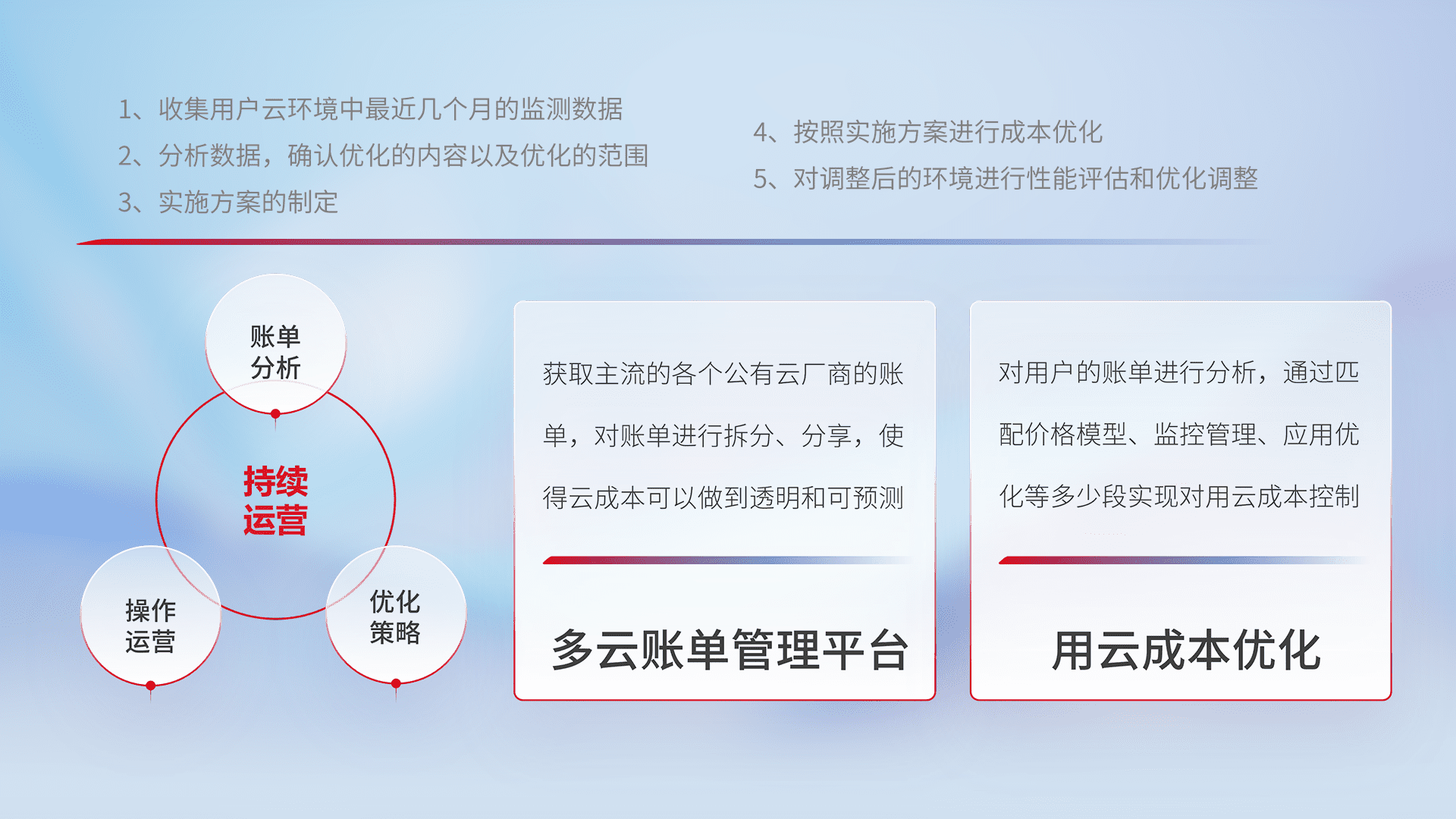通过多云纳管,,以统一的资源数据模型把客户的云资源进行抽象和封装,,,进而实现对多云资源的统一操作,,保障云资源管理的可靠性、、、稳定性与可用性。。量身定制化运维内容,,,,配置、、开发运维、、补丁管理、、、备份、、监控、、、认证和访问管理、、、审计和日常巡检等,,保障在用云过程中的可靠度,,,,稳定度以及高可用率。。。。